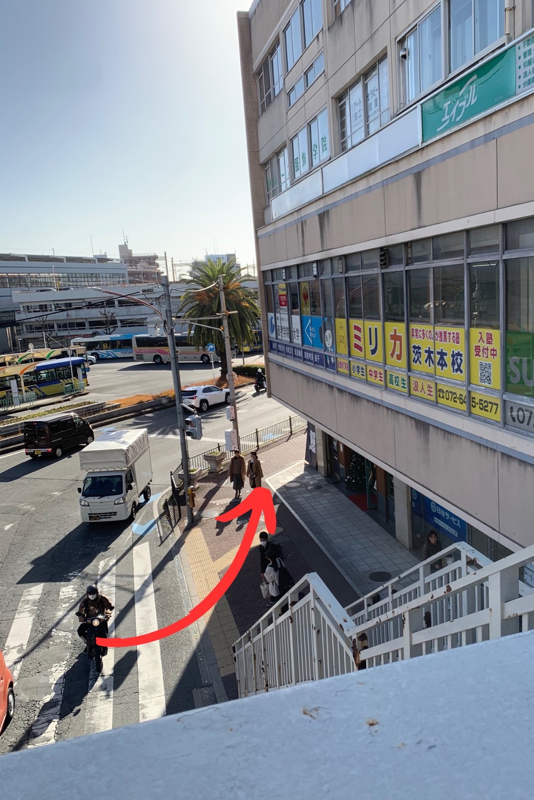 阪急茨木市駅の北改札口を出て前のエスカレーターを降ります。
