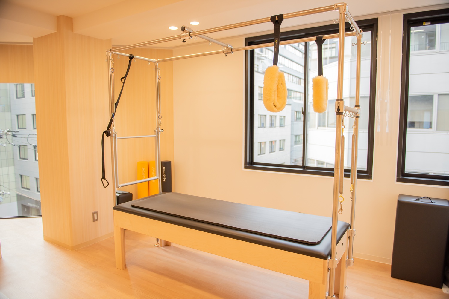 ベッドの周りにフレームがあり、スプリングやバーなどが取り付けられています。その構造上、空中にぶら下がるようなハードなエクササイズも可能な一方、その安定性・安全性からあまり起き上がる事のできない方のリハビリにも適していて、実際にリハビリの目的で導入している病院なども多いです。また左右の調整が別々にできるので、左右のバランスを整えるエクササイズする事ができます。